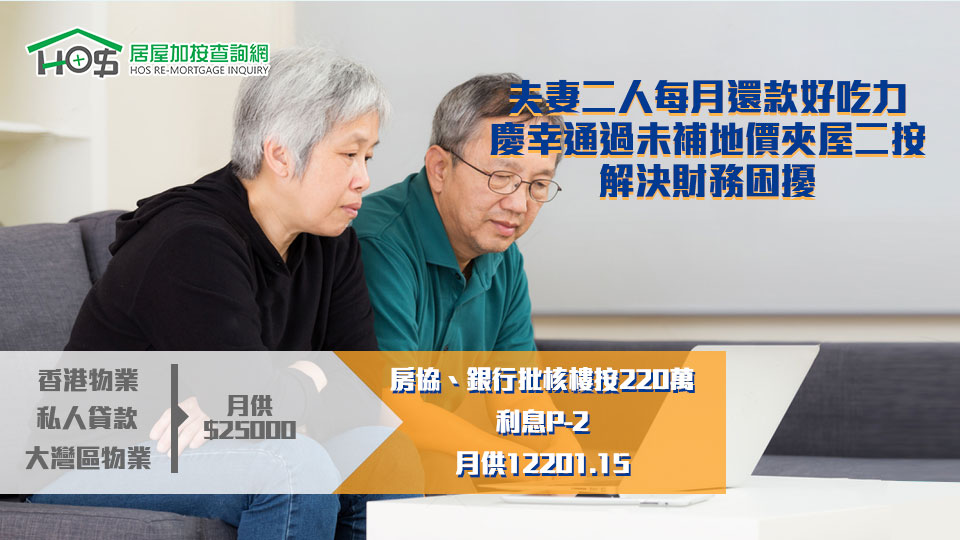 想用父母名下公屋申請加按淸數,因非家庭戶籍成員,房屋署拒批。萬念俱灰下,打算去財務公司借高息業主貸款,最終求助本公司,為其申請到房署/銀行批核,解決財困。……查看更多
